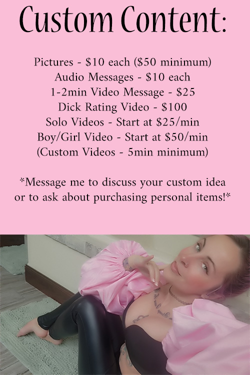 CUSTOMS: All customs will be priced according to what you are wanting in them. The minimum price will be $100 for 5min; it goes up from there. Customs have a turn around time of 1-2 weeks. I typically film on Saturdays.